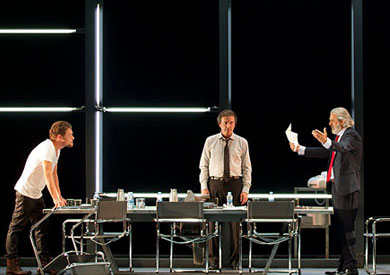Bajo un escenario impresionante en el Teatro Fernán Gómez, con un espacio para albergar grandes cantidades de público, se va formando una obra totalmente masculina, con tan sólo la intervención de una mujer en el vídeo central de toda la trama. A destacar ante todo los medios utilizados para dar forma a esta historia, que bajo el entorno de una oficina con marcos sin formas en las puertas, imponentes luces led y tres pantallas de importancia máxima para la obra con las que iremos descubriendo toda la historia.