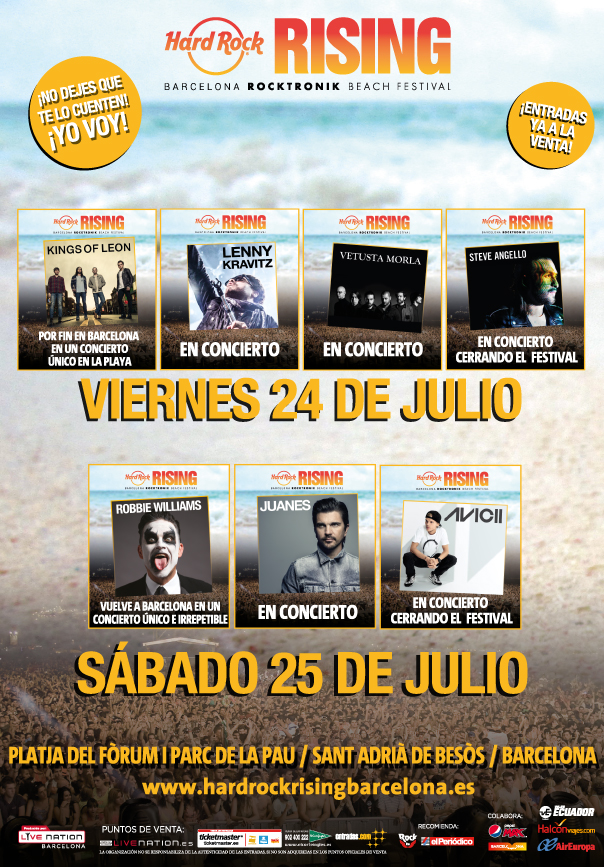 Hard Rock Rising se celebrará el 24 y 25 de julio en Barcelona y contará con la platja del fórum y Parc de la Pau (Sant Adrià del Besòs) como telón de fondo. Reunirá sobre su escenario a Kings of Leon, Robbie Williams, Lenny Kravitz, Juanes, Avicii, Steve Angello y Vetusta Morla, y Thalab. Hard Rock International eligió España tras valorar otros países europeos para continuar su vinculación con grandes eventos musicales.