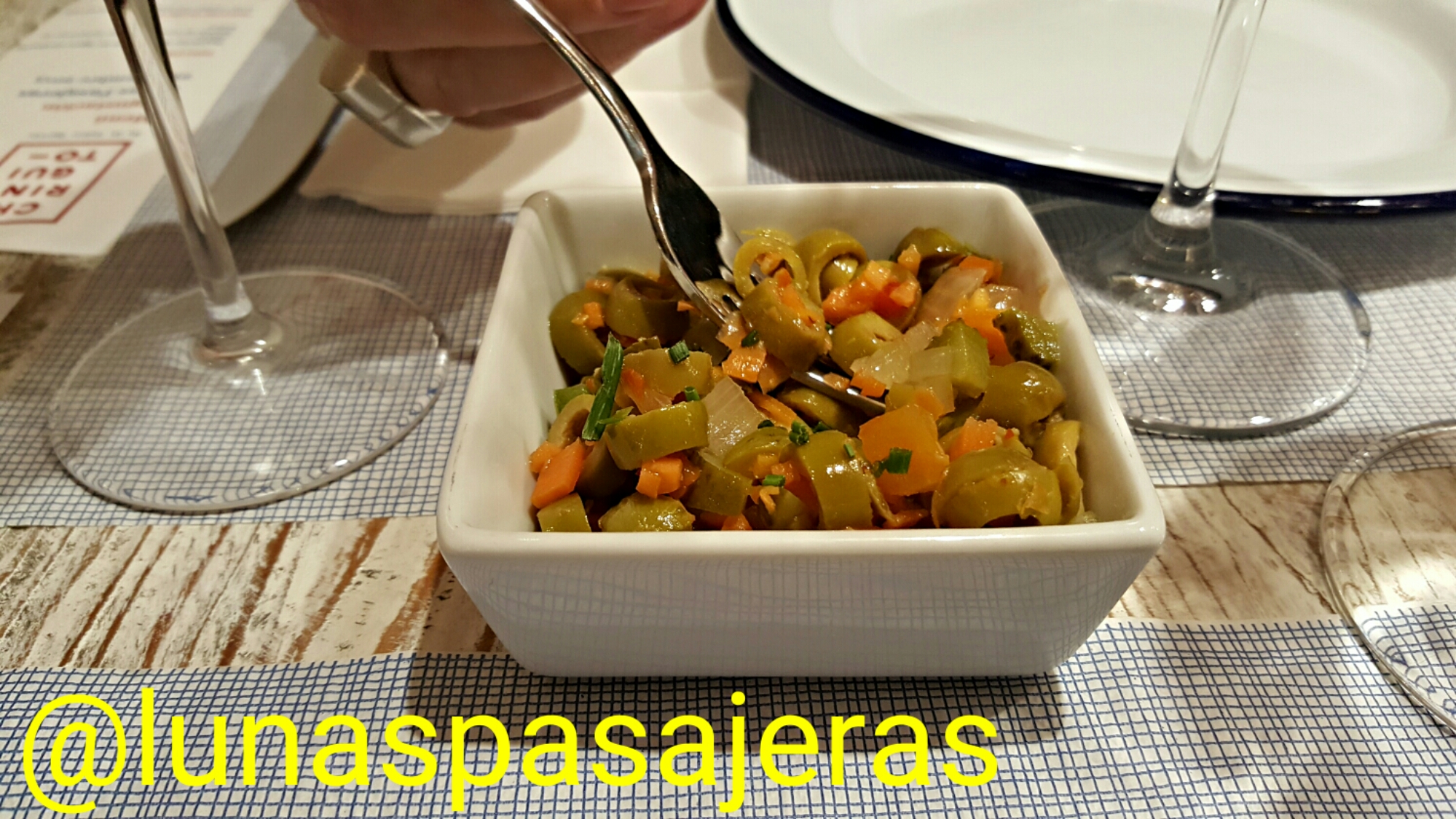 Sin más, paso a contaros lo que pude degustar en mi visita nocturna al chiringuito. Comenzamos con un delicioso aperitivo consistente en un picadillo de aceitunas, pimiento, pepinillo y todo aderezado para que no dejes ni rastro del plato y para ir abriendo boca de la mejor manera.