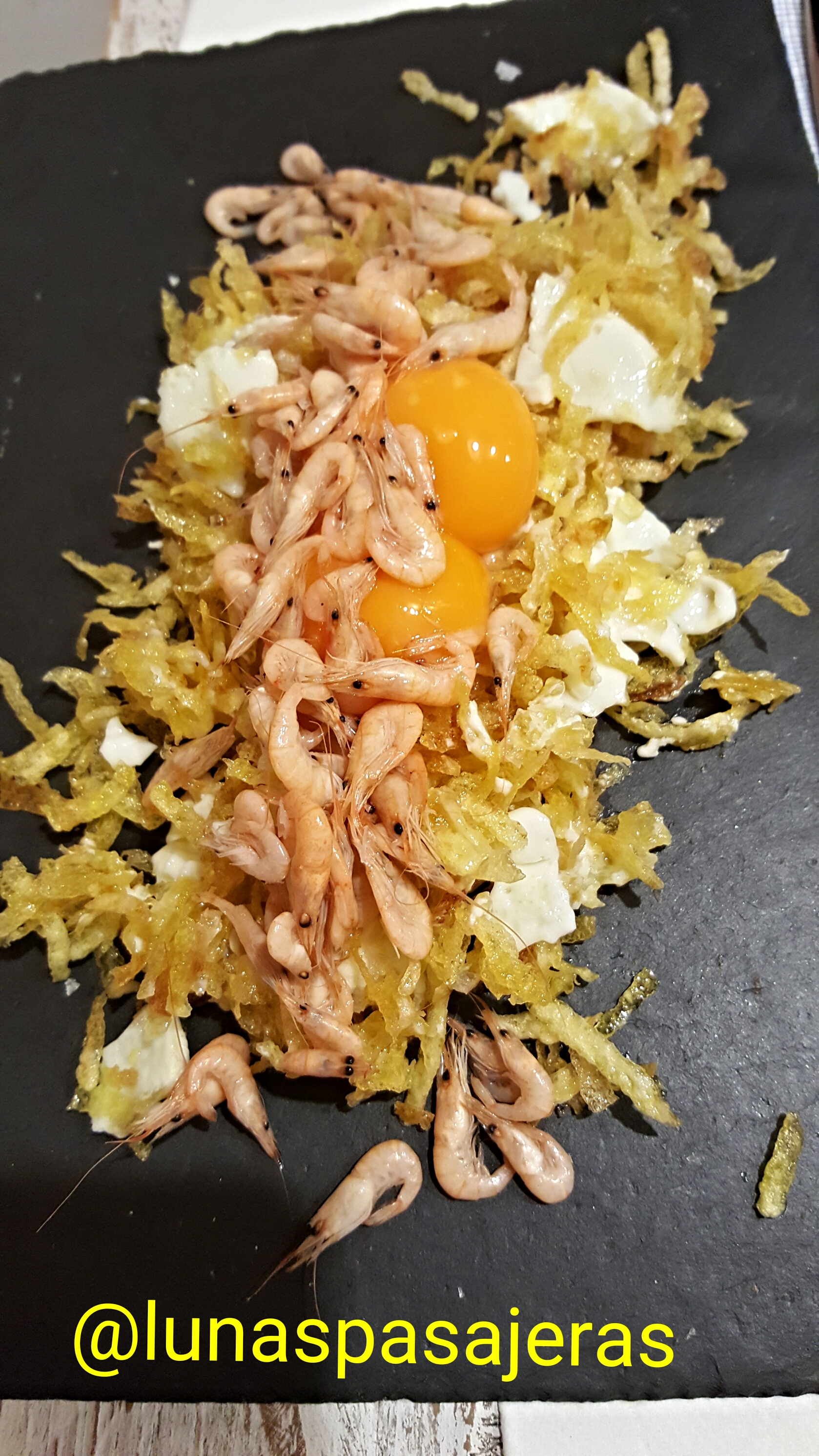 Para continuar nuestro viaje gastronómico seguimos con unos huevos de corral rotos con camarones de estero y como bebida una copa de vino blanco Ophalum del 2013. Otra gran apuesta cocinada de una manera muy especial mezclando las claras con las patatas paja y los camarones dejando las yemas en crudo, mezclando el intenso sabor de los huevos de corral con los camarones crujientes y las patatas pajas haciendo una propuesta muy original, vistosa y por supuesto, deliciosa.