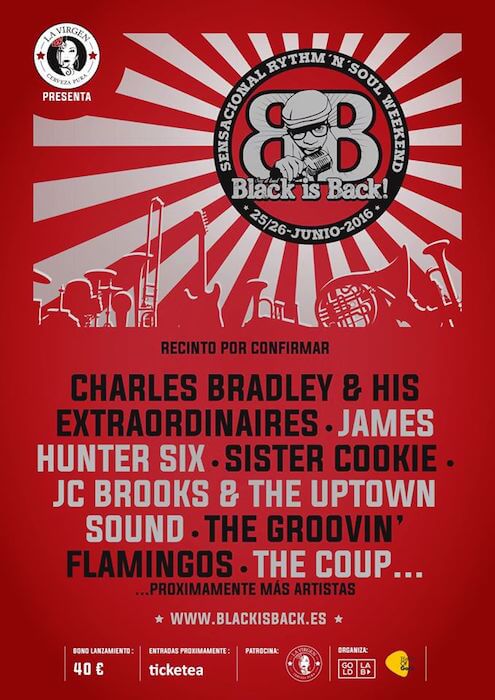 Charles Bradley and His ExtraordinariesSister CookieThe James Hunter SixJC Brooks & the Uptown SoundThe CoupThe Groovin’ FlamingosJames Taylor QuartetTT SyndicateENTRADAS BLACK IS BACK WEEKEND 2016