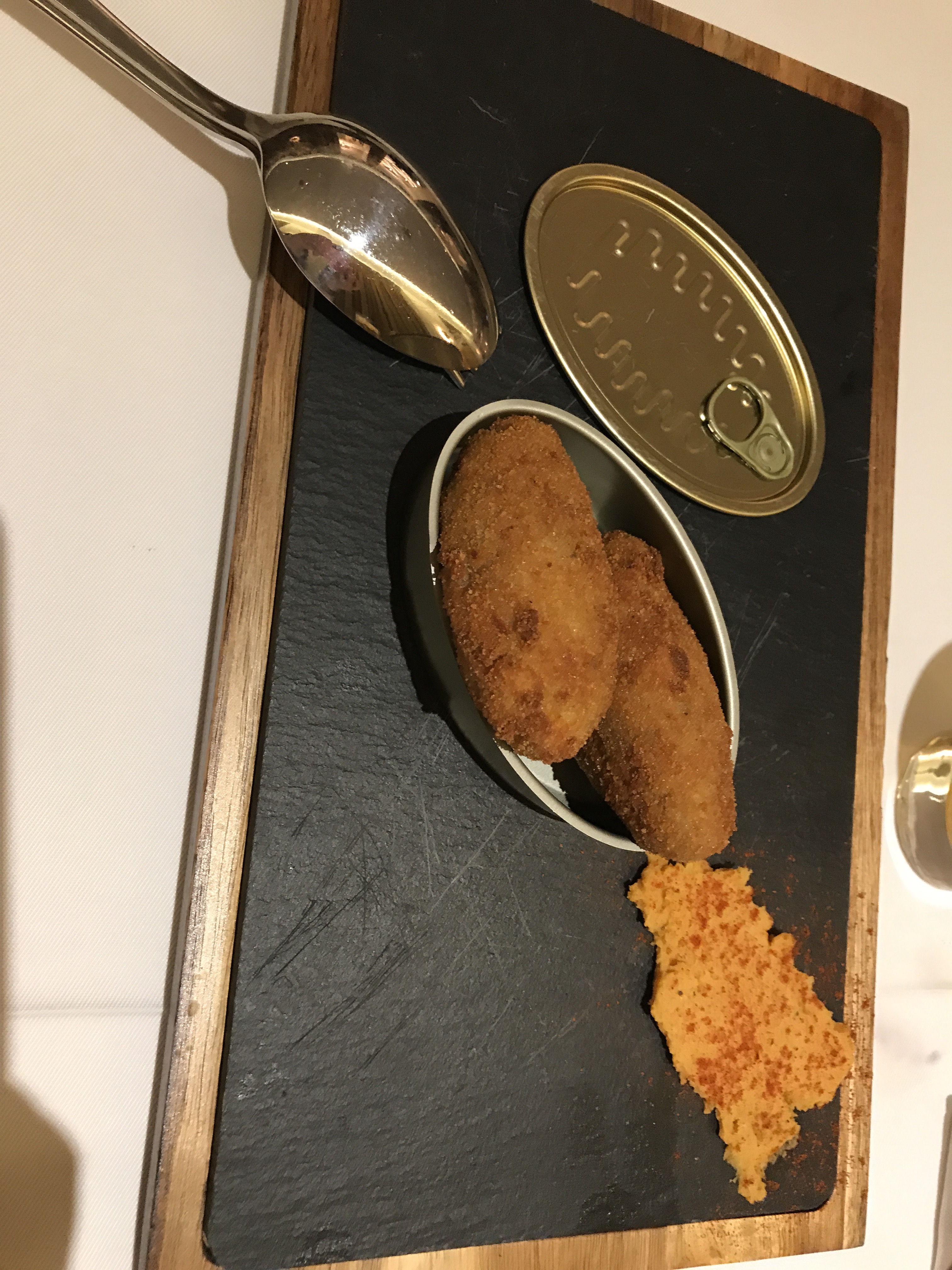 Comenzamos compartiendo unas croquetas de Pringá de cocido con hummus. Sin duda empezar de esta manera es entrar por la puerta grande, con un sabor consistente a la vez que meloso y unido a la suavidad del hummus y a su particular sabor te dan ganas de repetir una y otra vez. La presentación en una bandeja cuadrada y en una lata de conservas le dió la originalidad que terminó de redondear el entrante.