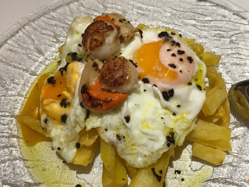 Después pudimos disfrutar de unos huevos rotos con aceite de trufa y zamburiñas, una mezcla explosiva con el grandioso acierto del aceite de trufa y las jugosas zamburiñas que conquistarán hasta al paladar más difícil.