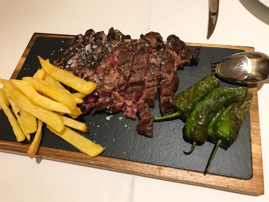 Tras estos deliciosos platos y entrantes, nos dispusimos a probar las joyas de la casa: Bacalao a la Vizcaína con fondo de pil pil y un Entrecot Gallego. Si los platos anteriores fueron un acierto, ya con esto pusimos la guinda final a la noche. Una calidad excelente que hace que todo se haga agua en la boca y una materia prima excelente sin duda, unida a una gran presentación y la cantidad justa para disfrutar de ello sin excederse o quedarse con ganas de más.