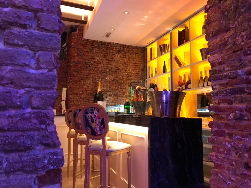 En El Secreto de Velázquez tenéis múltiples platos para elegir, pero las estrellas de la casa son las ostras, el caviar y el champagne Taittinger, el cuál ocupa y lidera uno de los dos salones. Las ostras son francesas y Spéciales Fines de Claire Nº2 de Live Fish y tenemos el Caviar Per Sé con una variedad siberiana Baerii, procedente del esturión siberiano del lago Baikal. El Taittinger Brut posee un 40% de Chardonnay, el porcentaje más alto de vinos espumosos para hacer un cóctel explosivo con sus burbujas y el caviar y sus esferas.