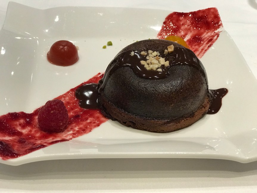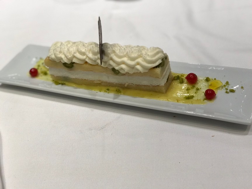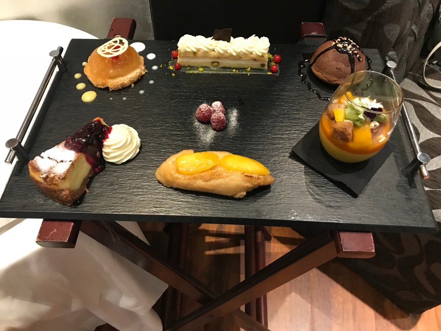 Para finalizar pasamos al postre, otro de los must del restaurante, ya que antes de elegir te vienen con una bandeja donde puedes ver todas las elaboraciones del maestro repostero de la casa y elegir el que prefieras, una elección muy, muy difícil. Nos decantamos por una tarta de chocolate blanco y coco con crema de limón al curry y pistachos y por un coulan de chocolate caliente. Como podéis ver, todos valen la pena y se merecen una oportunidad.