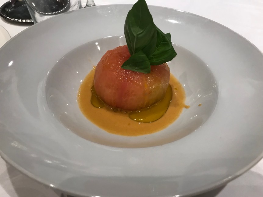 Comenzamos con el tomate especial Samarkanda, un tomate relleno de ventresca y bañado en salmorejo de albahaca. Esta es una manera excelente de comenzar cualquier comida gracias a su toque refrescante, suave y perfecto para ayudar a abrir el apetito para lo que viene después. Una receta aparentemente sencilla pero que es mucho más compleja de lo que parece.
