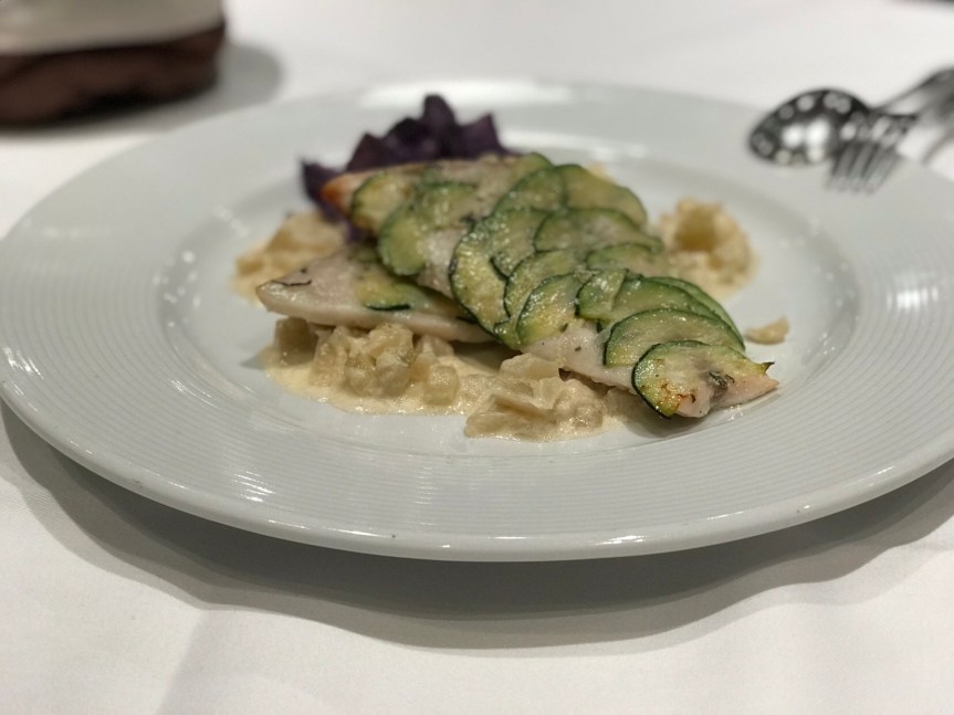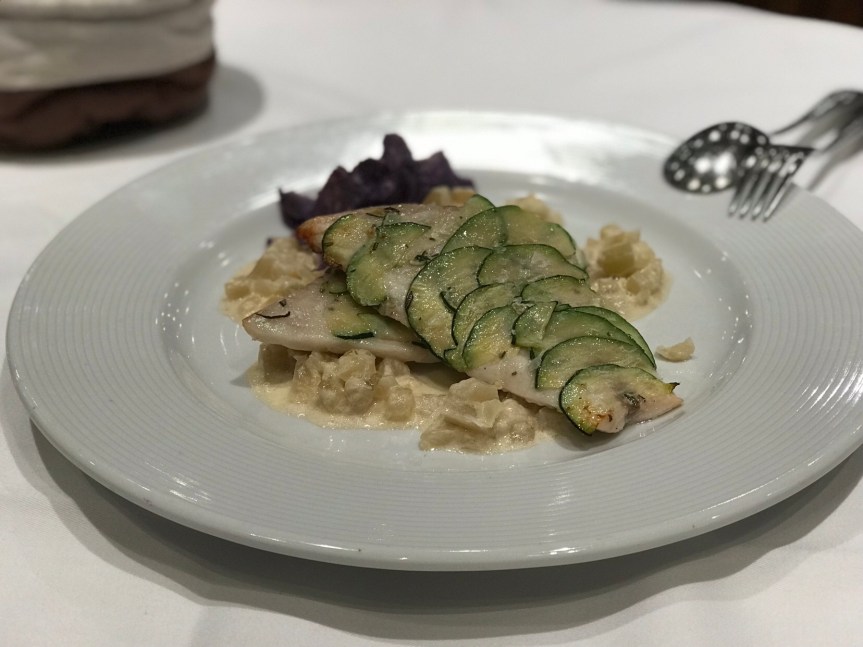 Para contrarrestar la carne, seguimos con el pescado que sin duda son uno de los puntos más fuertes del restaurante por su presentación y la calidad de sus productos. Pudimos degustar una Lubina salvaje con ragout de hinojo y calabacín y chips azules. La fama que les precede no es en vano, pues la lubina fue sin duda lo mejor de la noche y ya era complicado respecto a los excelentes platos anteriores. La suavidad y la frescura junto a su colorida y apetecible presentación fueron lo que le catalogó como la estrella de la noche.