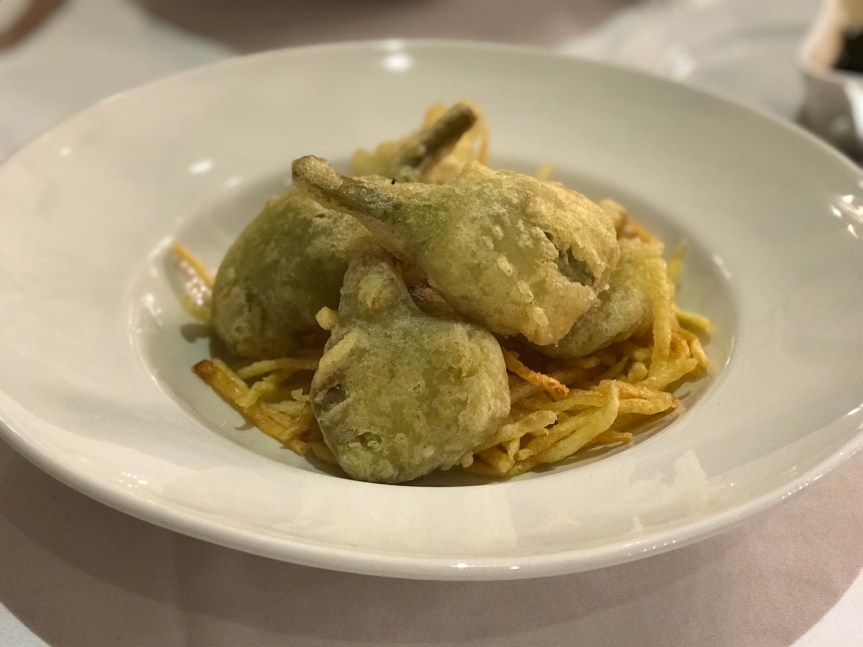 Seguimos con uno de mis platos favoritos de la noche que no os puedo dejar de recomendar: alcachofas en tempura con miel y salsa de soja. Puedes degustarlas con o sin la soja, de una forma tomándolas de una forma suave y muy agradable o bien dándoles un toque intenso con la soja que os hará querer acabar con ellas en un instante.