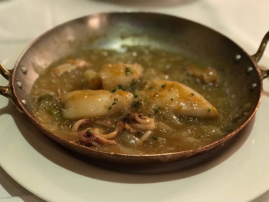 A continuación pudimos tomar una de las especialidades de la casa y no es un título ganado por azar: chipirones encebollados. Indescriptiblemente deliciosos, volarán de tu plato sin haberte dado cuenta. Y es que algo tiene el agua cuando la bendicen…