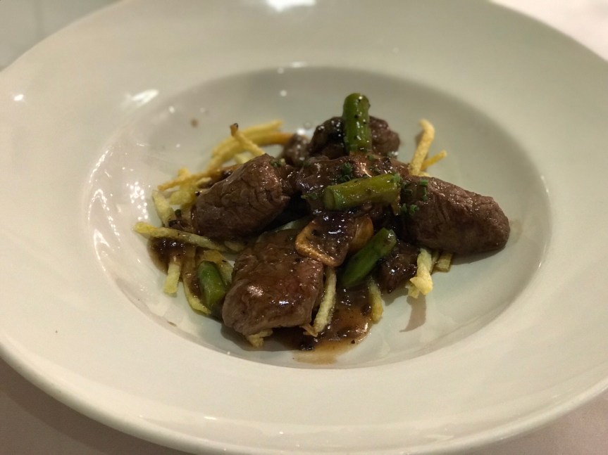 Para ir terminando, probamos el otro pilar del restaurante: el solomillo. Tierno y sabroso como se esperaba, se podía deshacer en tu boca sin que te dieses cuenta, del estilo a un estofado y también con una presentación a la altura de sus anteriores compañeros. Destacamos también la forma de sus deliciosas patatas fritas que pudimos ver en varias de sus propuestas.