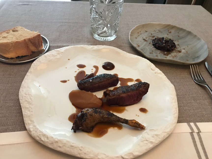 Para continuar, como plato fuerte y una gran apuesta me decanté por el pato salvaje con salsa de manzana, tamarindo y una terrina de anguila. Presentado en dos fases, primeramente el muslo con el foie y la carne, para terminar con la terrina. Delicioso sin duda alguna, toda una apuesta para los amantes del pato, siempre que tengáis la suerte de visitar el restaurante en temporada.