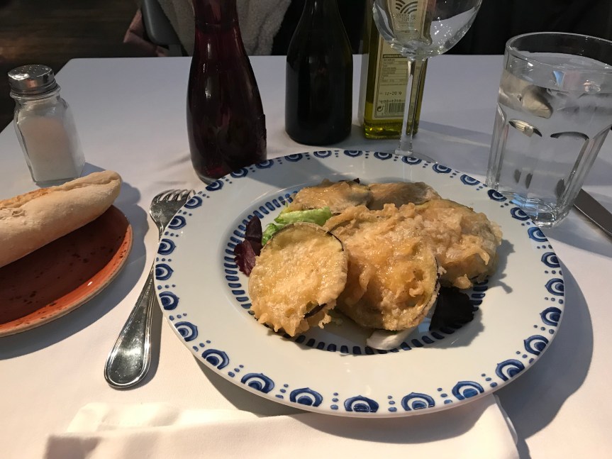 Comencé probando unas berenjenas rebozadas con miel que estaban deliciosas y venían acompañadas por una ensalada, un entrante dulce y con el que siempre se espera acertar.