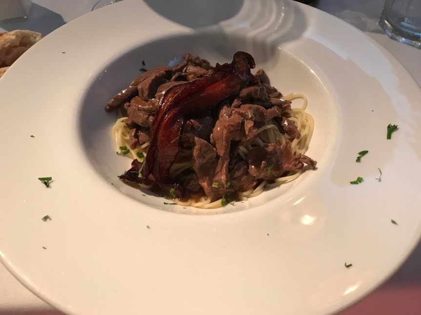 Para continuar pensé en unas tiras de ternera con pimientos asados y unos finos espaguetis, que bien recordaba a uno de los platos típicos de los restaurantes de comida China.