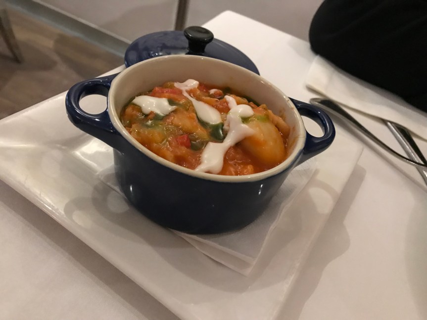 Continuamos con un steak tratar de solomillo con crackers de carbón, justo lo que esperábamos y con un diseño muy atractivo, quizás con la única pega de que estuvo un poco escaso. Junto al steak, probamos una cazuela de bacalao ajoarriero con marisco, también de indudable calidad y sabor pero también escaso, por lo que es ideal combinar platos como hicimos en nuestra visita.