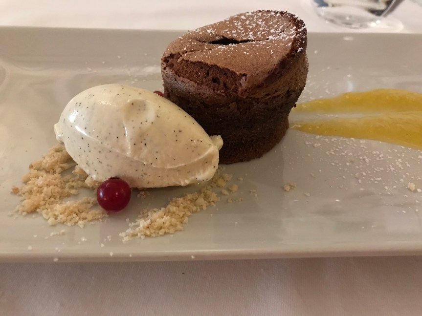 Finalizamos con un delicioso coulant de chocolate con nube de cacao, salsa de naranja y helado de praliné. Con su nombre ya os podéis hacer una idea del cóctel explosivo para nuestro paladar que se deshacía en nuestra boca como era de esperar, con la temperatura ideal y siendo la guinda perfecta para una buena comida.