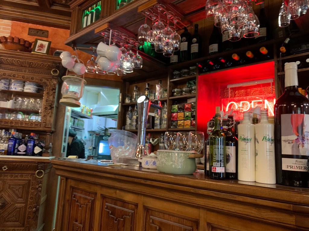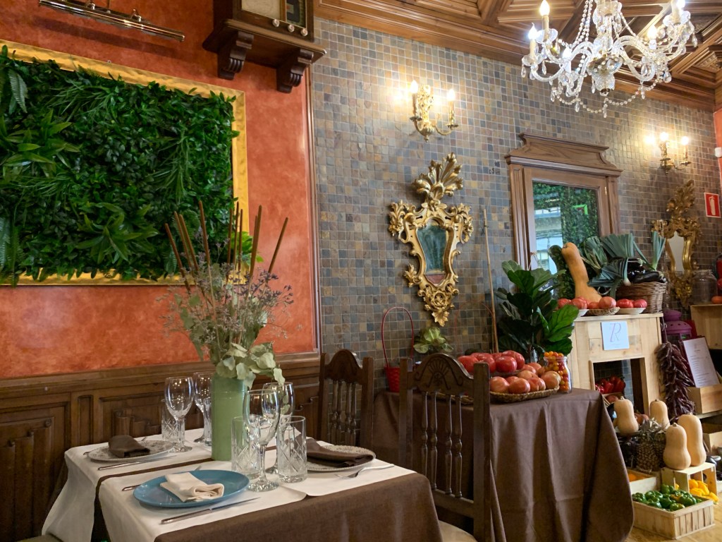 Nada más entrar también puedes ver la gran muestra de frutas y hortalizas que decoran el local con un gran carro, junto a varias mesas muy bien ubicadas para no agobiar ni hacerte sentir incómodo y darle ese toque hogareño característico, decorado con un ambiente clásico y kitsch que también recuerda con sus obras a un palacete clásico, donde además en su cocina también podréis encontrar influencias internacionales.