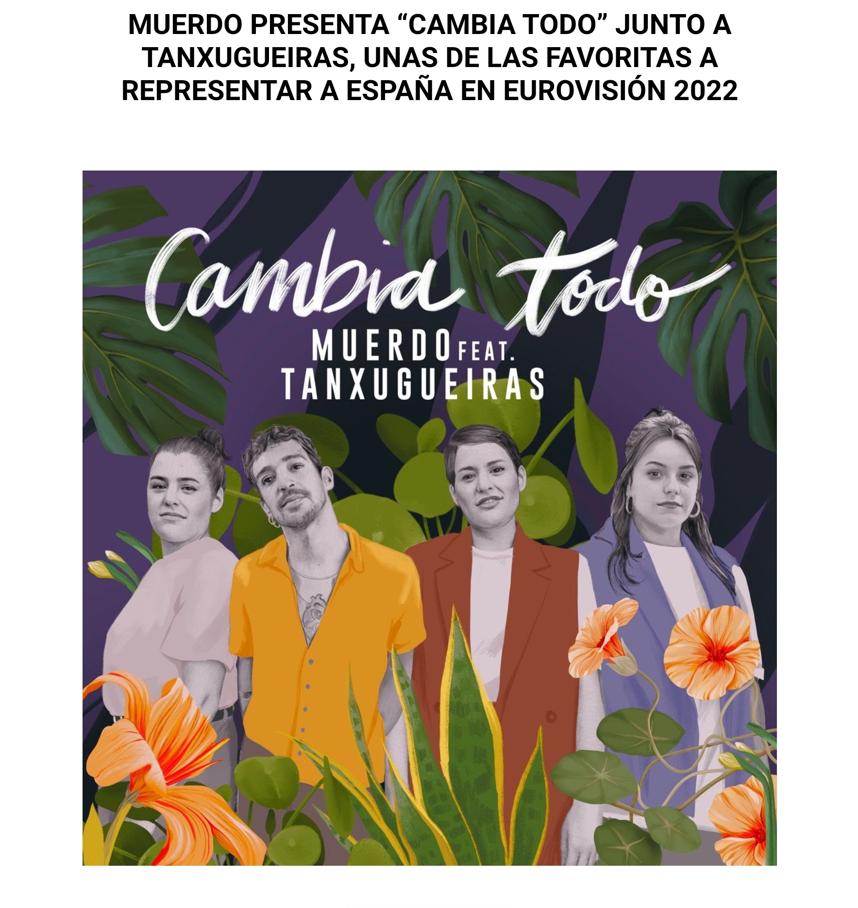 El artista murciano Muerdo presenta “Cambia Todo”, segundo adelanto del nuevo disco que el cantante presentará en 2022, que supondrá una revisión de algunas de las canciones de sus cinco discos. Contará con colaboraciones nacionales e internacionales de artistas que han marcado e influido a Muerdo a lo largo de su carrera y otros más emergentes con los que se ha desarrollado una afinidad, en esta oportunidad con Tanxugueiras, el trio gallego que esta arrasando formado por Aida Tarrío y las gemelas Olaia y Sabela Maneiro.