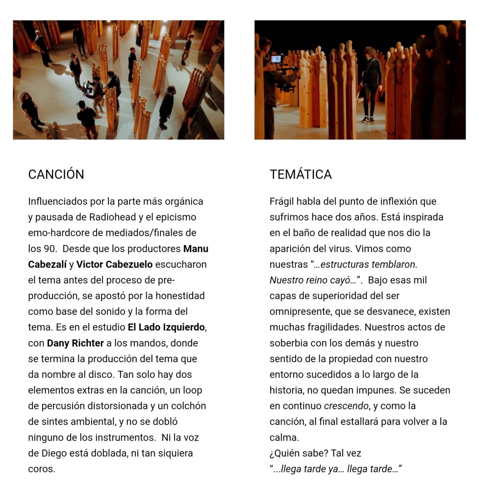 Por primera vez en nuestra carrera, lanzamos como single un tema lento y pausado. Algo que no suele ser muy habitual en nuestro estilo, además esta canción da nombre a los próximos EPs (Frágil 1 y Frágil 2). Pero con Frágil, nos lanzamos al vacío, ya que no queríamos que este tema quedara en el olvido al que pertenecen las canciones que no adquieren el estatus de single. Creemos que por encima de las leyes del “mercado de las escuchas” está el contenido artístico de las bandas.