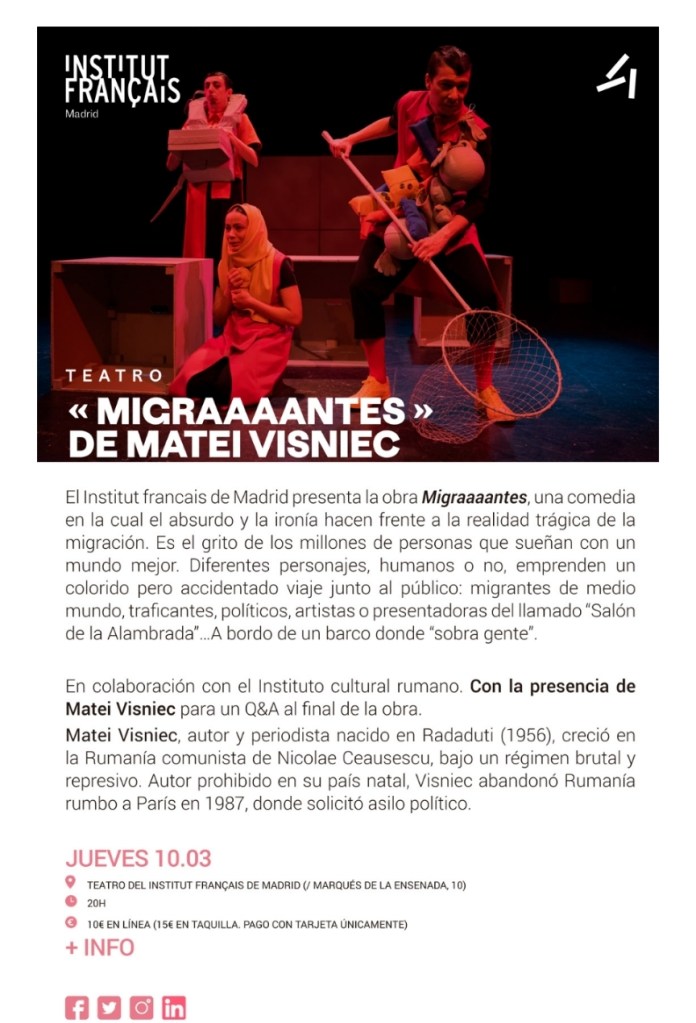 El Institut Francés presenta «Migraaaantes» de Matei Visniec Esther Soledad Esteban Castillo, Madrid Comparte esto: Compartir en X (Se abre en una ventana nueva) X Comparte en Facebook (Se abre en una ventana nueva) Facebook Me gusta Cargando...