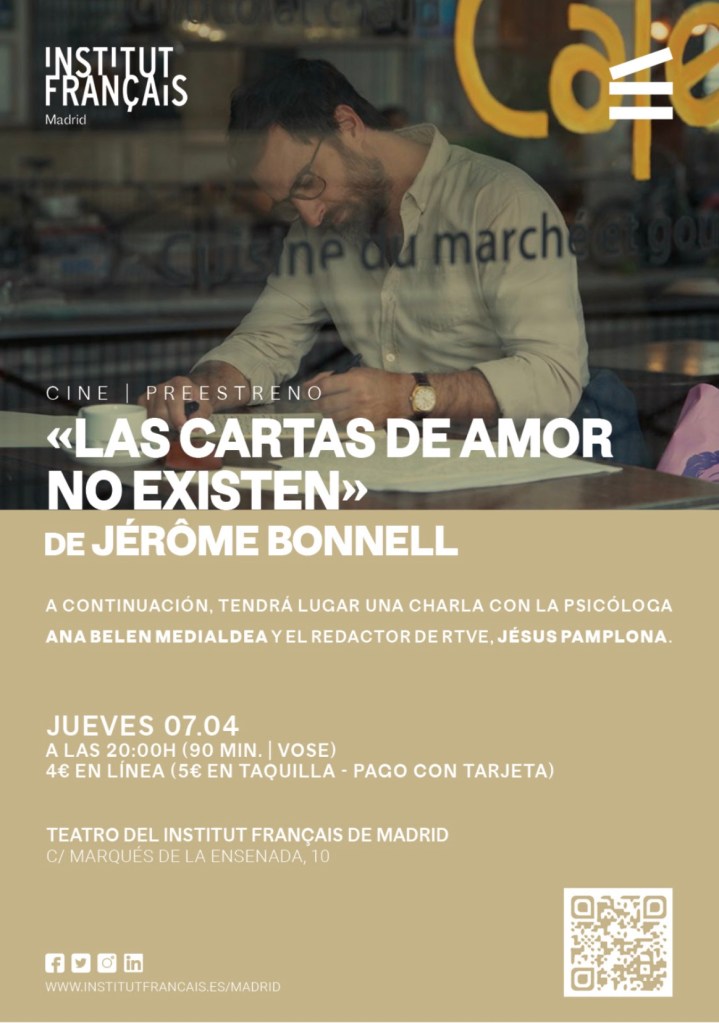 El Instituto Francés de Madrid presenta el preestreno de ‘Las cartas de amor no existen’ de Jérôme Bonnell Esther Soledad Esteban Castillo, Madrid Comparte esto: Haz clic para compartir en X (Se abre en una ventana nueva) X Haz clic para compartir en Facebook (Se abre en una ventana nueva) Facebook Me gusta Cargando...