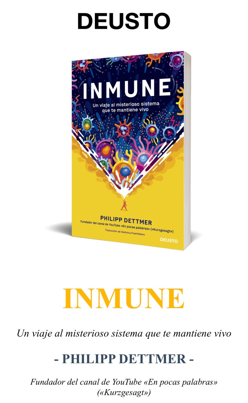 En Inmune, Dettmer continúa y amplía la labor de divulgación que realiza en su famosísimo canal de YouTube «En pocas palabras», uno de los más vistos del mundo. Lleno de atractivos gráficos e ilustraciones, este libro riguroso pero para todos los públicos nos invita a un viaje para conocer con detalle cómo funciona y cómo nos protege nuestro sistema inmunitario.