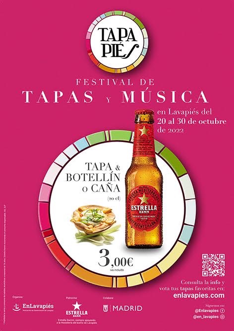 Más de 100 bares y restaurantes de Lavapiés participan en la duodécima edición de Tapapiés, del jueves 20 al domingo 30 de octubre. Entre sus novedades, los populares conciertos gratuitos a pie de calle regresan al barrio madrileño, tras dos años sin ellos a causa de la pandemia. 11 días para degustar tapas y músicas del mundo, también con la participación de los Mercados de San Fernando y Antón Martín. Estrella Damm patrocina Tapapiés por decimoprimer año consecutivo. Organiza la Asociación de Comerciantes de Lavapiés.