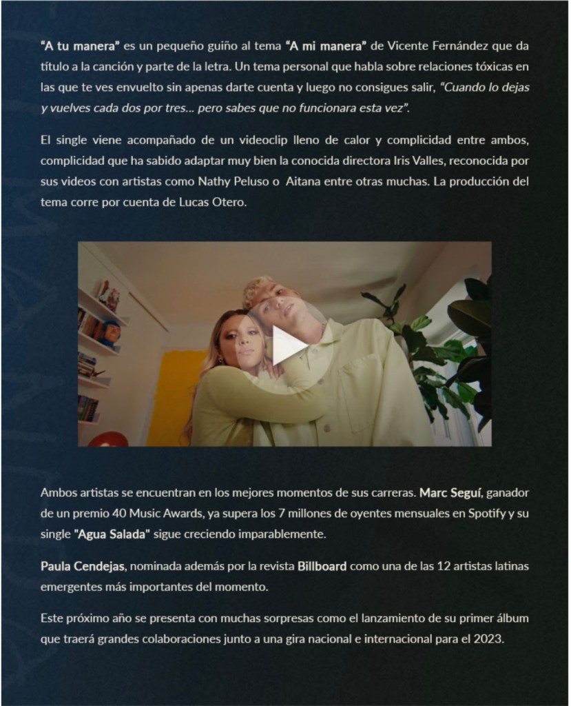 Paula Cendejas y Marc Seguí presentan “A tu Manera” Esther Soledad Esteban Castillo Comparte esto: Haz clic para compartir en X (Se abre en una ventana nueva) X Haz clic para compartir en Facebook (Se abre en una ventana nueva) Facebook Me gusta Cargando...
