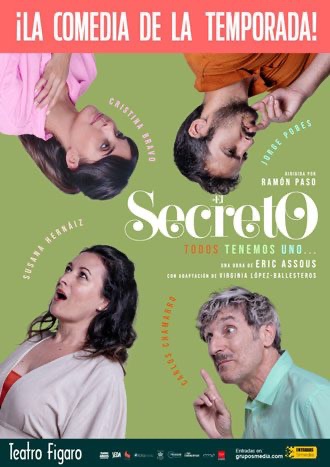 El Secreto. Todos tenemos uno… ¿Y si se te escapa?, una obra de Eric Assous dirigida por Ramón Paso en el Teatro Fígaro de Madrid. Dos parejas. Dos historias de amor y desamor donde todos tienen algo que ocultar. En esta hilarante comedia donde nada es lo que parece, las sorpresas irán en crescendo hasta un desenlace totalmente inesperado.