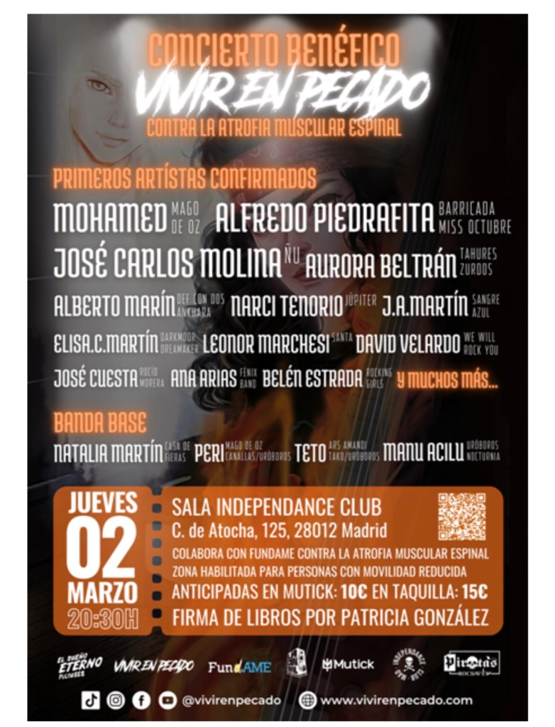 Esta increíble canción sirvió para anunciar la edición de la novela “Vivir En Pecado”, tercer libro publicado ya por Patricia González. Con el lanzamiento de este tema inédito (al que seguirán muchas sorpresas), unido a la publicación del libro “Vivir En Pecado” se quiere colaborar y dar visibilidad social a la Atrofia Muscular Espinal y con ello a la Fundación FundAME que lleva años luchando y ayudando a los afectados y sus familias.