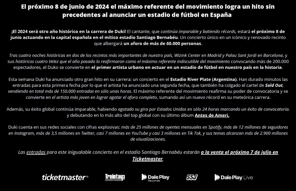 Duki anuncia un concierto en el Estadio Santiago Bernabéu el 8 de junio del 2024 Esther Soledad Esteban Castillo Comparte esto: Haz clic para compartir en X (Se abre en una ventana nueva) X Haz clic para compartir en Facebook (Se abre en una ventana nueva) Facebook Me gusta Cargando...