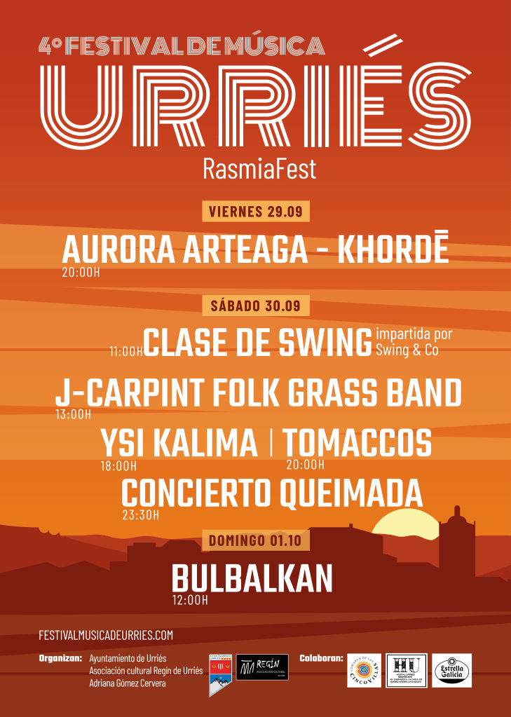 Por los distintos escenarios – ubicados en la Plaza Mayor y en la carpa del escenario principal así como por las calles del pueblo- del Festival de Música de Urriés pasarán la cantante y compositora Aurora Arteaga, primera española en graduarse en la prestigiosa Manhattan School of Music en Master of Music in Jazz Performance junto con su quinteto de cuerda y percusión para presentar su proyecto, Aurora Arteaga – Khordē, los zaragozanos J-Carpint Folk Grass Band, con su fusión de música de raíz americana y música aragonesa, presentando su primer trabajo, la cantante navarra Ysi Kalima, quien en un concierto íntimo en la plaza mayor interpretará canciones de su último trabajo discográfico, Miscelánea, el grupo swing Tomaccos, quienes a pesar de su juventud cuentan con tres discos a sus espaldas y más de 180 conciertos y las chicas más divertidas y guerreras, Bulbalkan, que con un genial pasacalles interpretarán temas propios y versiones de composiciones balcánicas, como Kalashnikov, Caravan o Bubamara, entre otros.