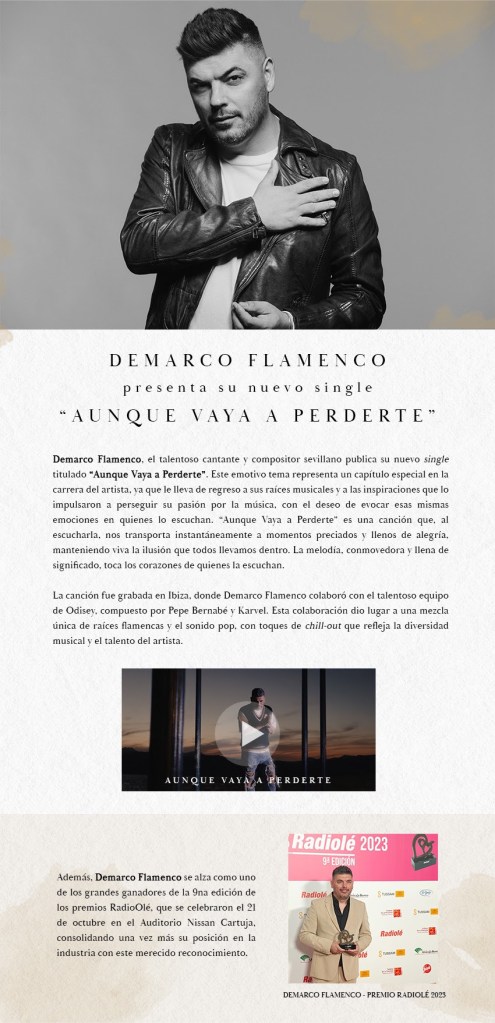 Demarco Flamenco presenta su nuevo single “Aunque Vaya a Perderte” Esther Soledad Esteban Castillo Comparte esto: Compartir en X (Se abre en una ventana nueva) X Comparte en Facebook (Se abre en una ventana nueva) Facebook Me gusta Cargando...