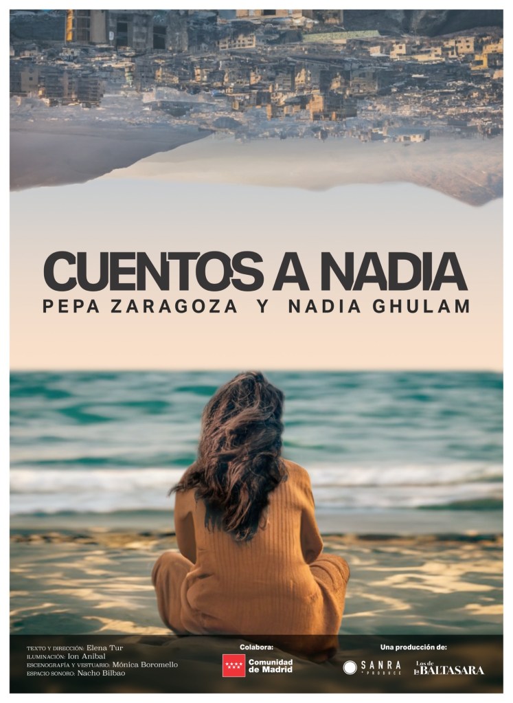 En «Cuentos a Nadia» la intérprete Pepa Zaragoza, se convierte en Qamar, una mujer afgana que desde niña se vio obligada a adoptar el rol de niño, Bacha Posh ( niña vestida de niño), para sobrevivir en su Kabul natal, bajo el dominio del régimen talibán. Durante el proceso de investigación para crear esta pieza fue imposible no toparse con la figura de Nadia Ghulam, refugiada afgana afincada en España que durante años tuvo que vestirse de hombre para sacar adelante a su familia en Afganistán.