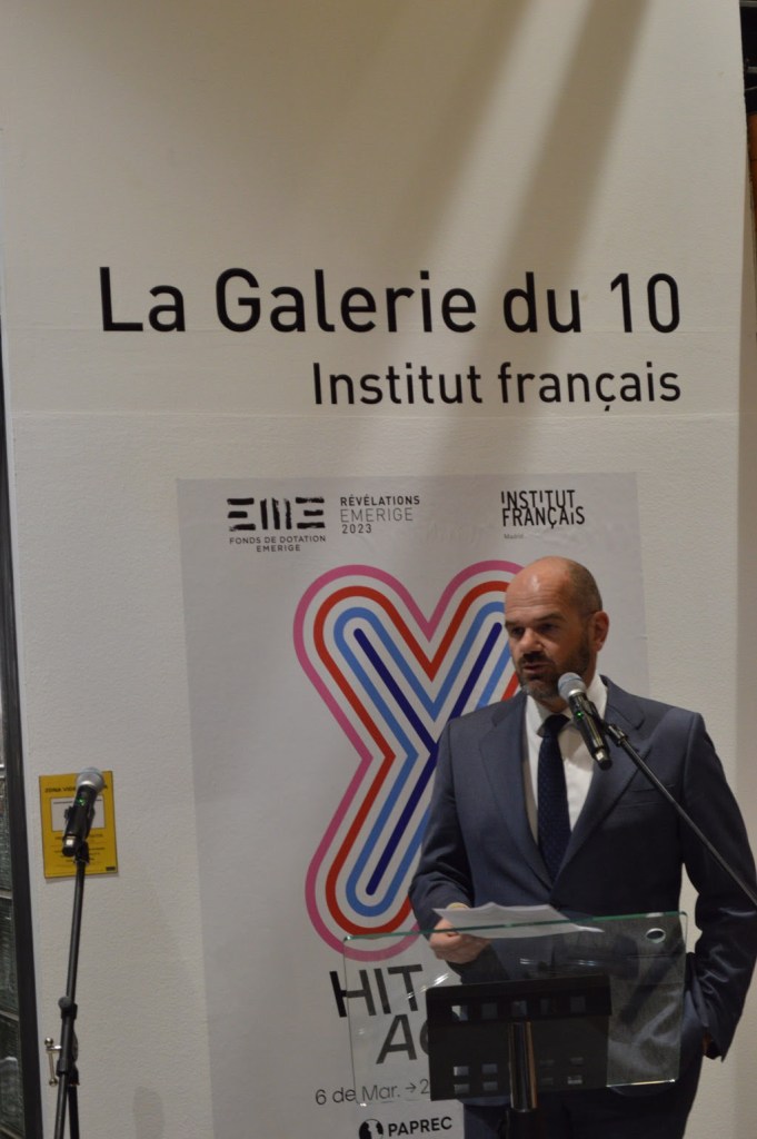 Éric Tallon, Consejero Cultural de la Embajada de Francia en España, Director General del Institut français de España, introdujo el acto. Recordó que «un año más, el mundo del arte contemporáneo se daba cita en Madrid«. Referente a la feria ARCOmadrid, dijo que era «una feria con la que tenemos el privilegio de colaborar. Y de nuevo, tenemos el placer de participar en este gran encuentro acogiendo una exposición en la galería del Institut français de Madrid«. Sobre la exposición Hit again, subrayó que era «una vez más, un homenaje a los jóvenes artistas. Espero que contribuya a crear nuevos diálogos entre España y Francia. Nuestro objetivo, con esta exposición, es la de tender puentes entre las escenas artísticas de los dos países así como profundizar la intensidad de nuestros intercambios artísticos, y lo digo delante de numerosos profesionales«. La Beca Révélations Emerige es un «programa que se ha convertido en un ejemplo en materia de apoyo a los jóvenes artistas contemporáneos franceses«.