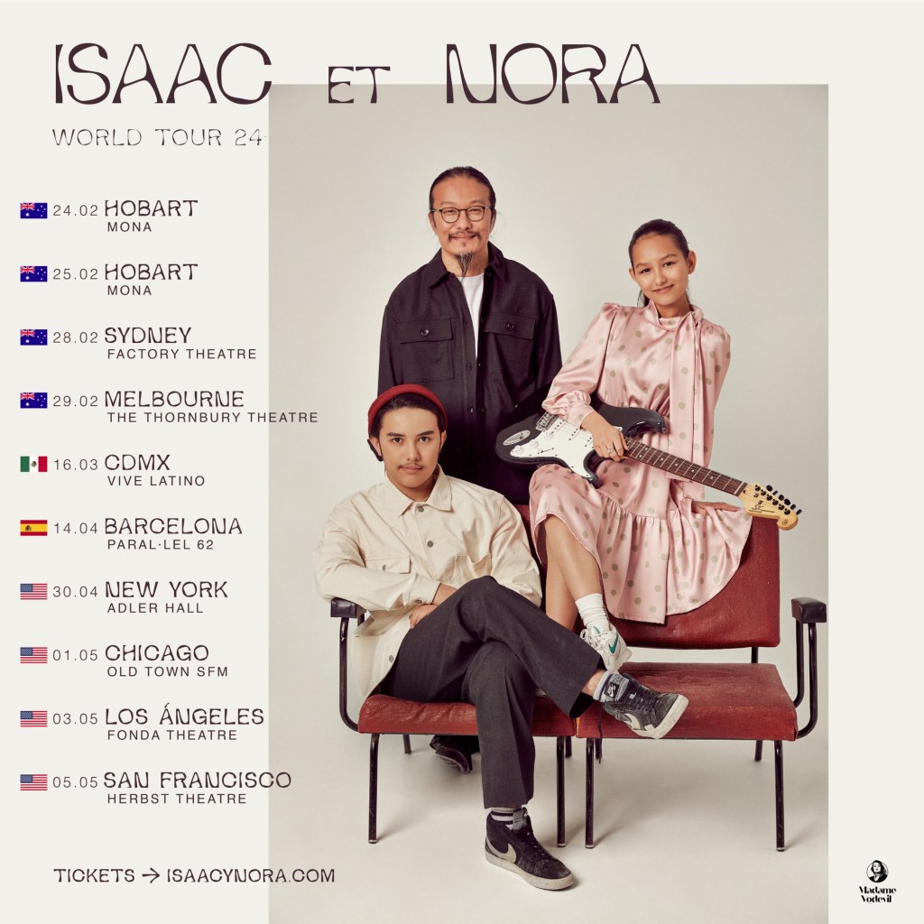Tras una gira en 2023 de más de 11 países llenando grandes teatros de las capitales latinoamericanas, y un comienzo de 2024 frenético, con paradas en Australia (febrero) y México (marzo), Isaac et Nora se preparan para su primera gira Estados Unidos en abril. Entre medias, el 14 de abril se presentarán por primera vez en la sala Parallel 62 de Barcelona.