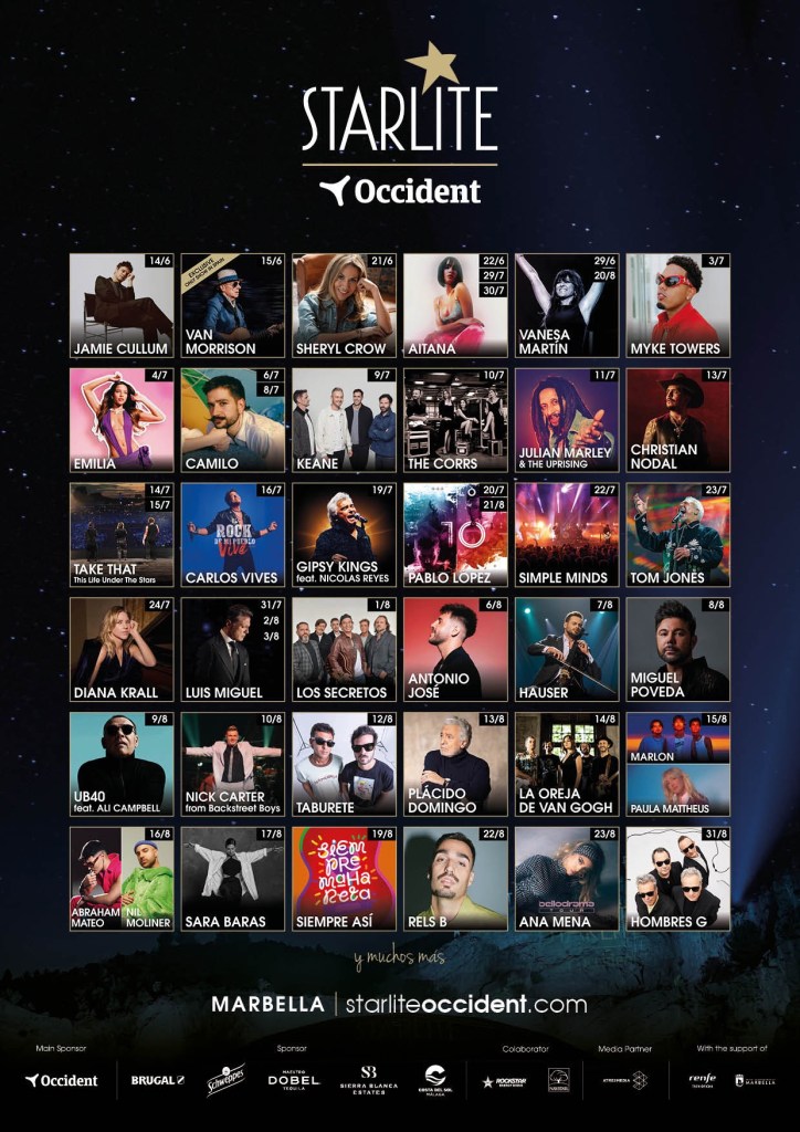 El cartel de Starlite Occident 2024 ya cuenta las confirmaciones de artistas como Jamie Cullum (viernes 14 de junio), Sheryl Crow (viernes 21 de junio), Aitana (sábado 22 de junio, lunes 29 de julio, martes 30 de julio), Vanesa Martín (sábado 29 de junio), Myke Towers (miércoles 3 de julio), Emilia (jueves 4 de julio), Camilo (sábado 6 y lunes 8 de julio), Keane (martes 9 de julio), The Corrs (miércoles 10 de julio), Julian Marley & The Uprising (jueves 11 de julio), Christian Nodal (sábado 13 de julio), Take That (domingo 14 y lunes 15 de julio), Carlos Vives (martes 16 de julio), Gipsy Kings feat. Nicolas Reyes (viernes 19 de julio), Pablo López (sábado 20 de julio y miércoles 21 de agosto), Simple Minds (lunes 22 de julio), Tom Jones (martes 23 de julio), Diana Krall (miércoles 24 de julio), Luis Miguel (miércoles 31 de julio, y viernes 2 y sábado 3 de agosto), Los Secretos (jueves 1 de agosto), Antonio José (martes 6 de agosto), Hauser (miércoles 7 de agosto), Miguel Poveda (jueves 8 de agosto), UB40 ft. Ali Campbell (viernes 9 de agosto), Nick Carter (sábado 10 de agosto), Taburete (lunes 12 de agosto), Plácido Domingo (martes 13 de agosto), La Oreja de Van Gogh (miércoles 14 de agosto), Paula Mattheus & Marlon (jueves 15 de agosto), Abraham Mateo & Nil Moliner (viernes 16 de agosto), Sara Baras (sábado 17 de agosto), Siempre Así (lunes 19 de agosto) Vanesa Martín (martes 20 de agosto), Rels B (jueves 22 de agosto), Ana Mena (viernes 23 de agosto) y Hombres G (sábado 31 de agosto).