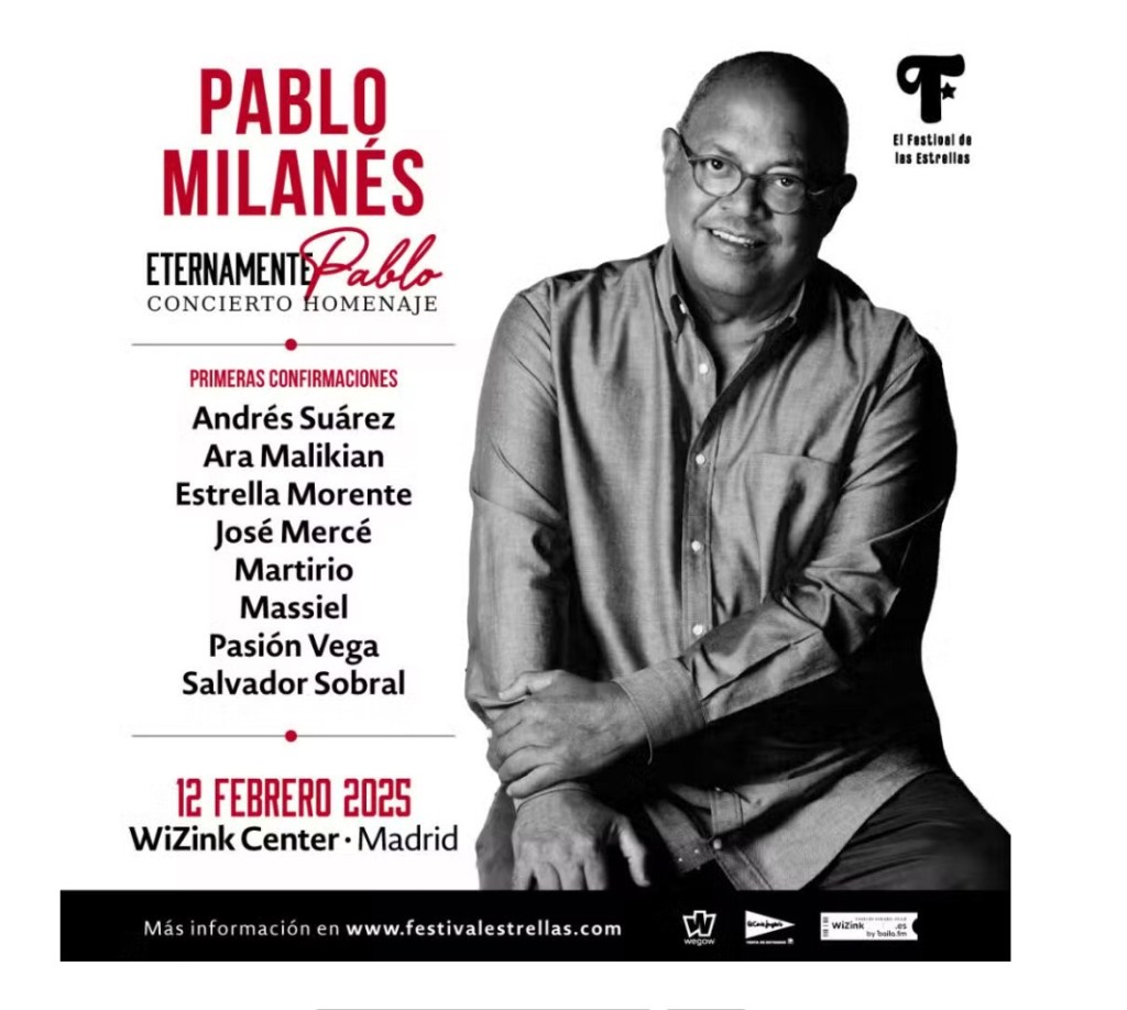 “Eternamente Pablo”: El concierto homenaje a Pablo Milanés, que tendrá lugar el 12 de febrero de 2025, en el WiZink Center de Madrid, con artistas ya confirmados como Andrés Suárez, Ara Malikian, Estrella Morente, José Mercé, Martirio, Massiel, Pasión Vega, Salvador Sobral y muchos más por anunciar.