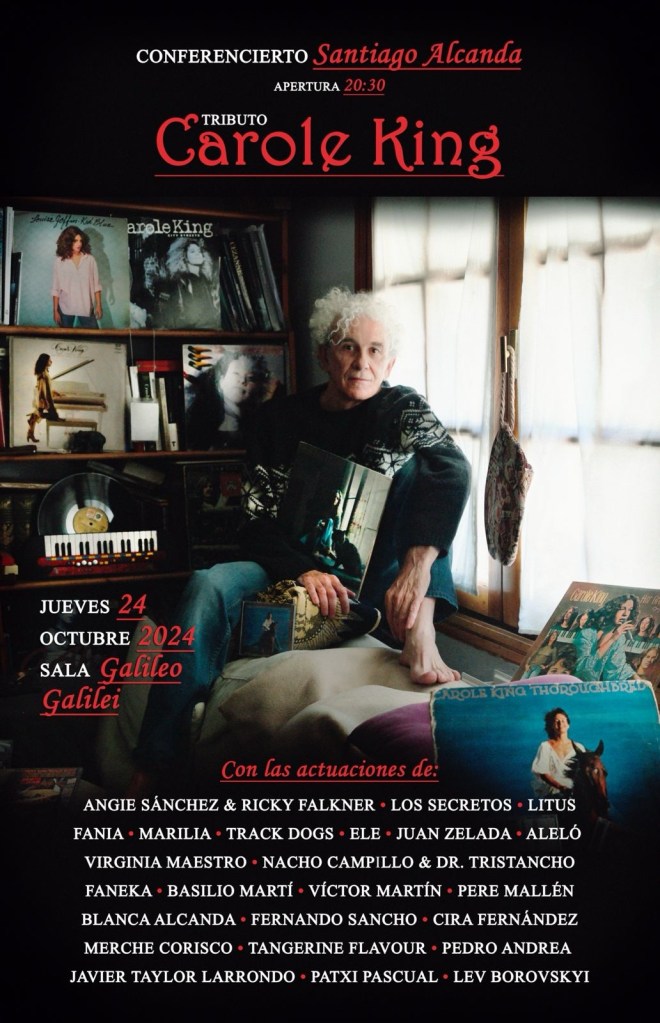 Ya hemos disfrutado de otros muchos Conferenciertos dirigidos y presentados por Santiago Alcanda de artistas como FleetwoodMac, Elton John, Eagles etc.. Un Tributo que lleva a cabo con prestigiosos músicos españoles donde dan vida de nuevo a las canciones más significativas, todo ello aderezado con suculentas explicaciones que hace Santiago Alcanda por el recorrido discográfico y biográfico amenizado con videos y diapositivas. El día 24 de octubre le toca el turno a Carole King.