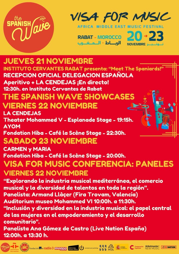The Spanish Wave realizará, junto al Instituto Cervantes de Rabat la recepción oficial “Meet The Spaniards!” donde lxs delegadxs y profesionales acreditados a Visa For Music podrán conocer personalmente a los artistas y profesionales de nuestro país. Será en el Instituto Cervantes el jueves 21 de noviembre a partir de las 12:30 pm y contará con la bienvenida del director del festival y la actuación en directo de LA CENDEJAS.