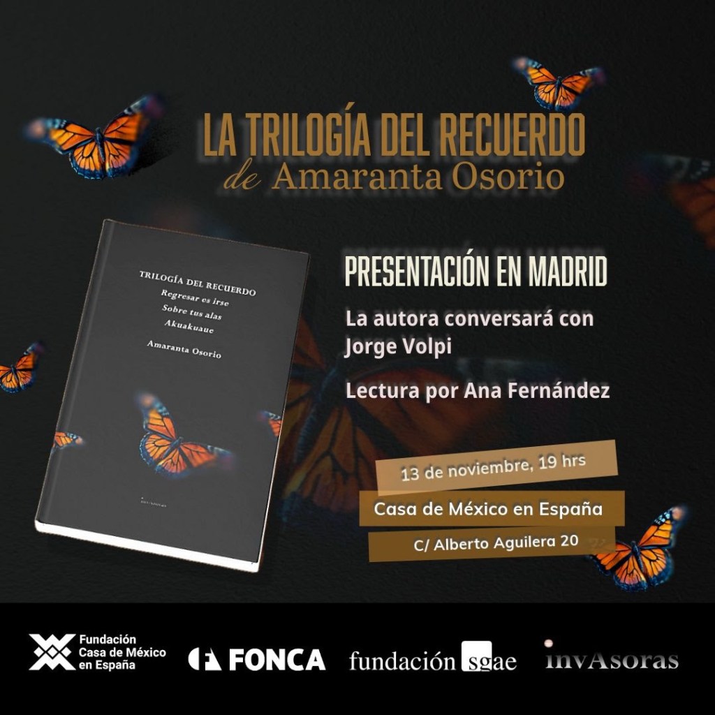 El próximo 13 de noviembre tendrá lugar en la Casa de México la presentación del libro La trilogía del recuerdo de Amaranta Osorio, publicado por Ediciones Invasoras con el apoyo de la Fundación Autor. Este libro reúne tres obras teatrales de una autora que tiene un fuerte vínculo con México, dos de ellas para adultos y la tercera para público familiar, que indagan sobre la memoria de la violencia: la memoria silenciada, la memoria en el cuerpo, la memoria histórica, la memoria de los ancestros y la memoria de la violencia hacia los animales y la naturaleza. La presentación consistirá en una conversación entre Amaranta Osorio y Jorge Volpi, reconocido novelista mexicano que recientemente ha sido nombrado como próximo director artístico del Centro de Cultura Contemporánea Condeduque de Madrid. A ellos se sumará la actriz Ana Fernández, que hará una lectura dramatizada de algunos fragmentos de las obras.