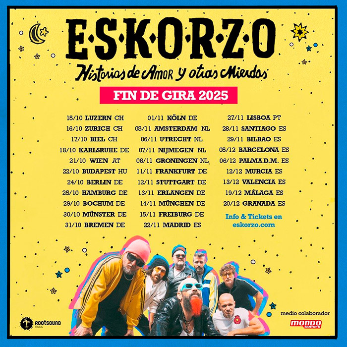 Eskorzo, la banda granadina con casi tres décadas liderando el mestizaje musical, anuncia su gira internacional de despedida del aclamado álbum «Historias de Amor y otras Mierdas», que ha superado los 5 millones de escuchas en plataformas digitales. Tras conquistar escenarios en toda Europa con más de 100 conciertos llenos de energía, pasión y ritmos que conectan corazones, Eskorzo anuncia nuevas fechas para despedir este octavo álbum de estudio por todo lo alto.