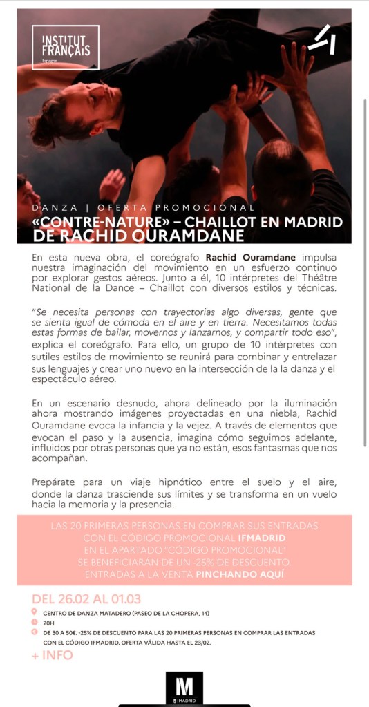 “Contre-Nature”-Chaillot en Madrid de Rachid Ouramdane llega al Institut Français de Madrid https://tienda.madrid-destino.com/es/centro-danza-matadero/chaillot-theatre-national-de-la-danse-rachid-ouramdane/ Esther Soledad Esteban Castillo Comparte esto: Compartir en X (Se abre en una ventana nueva) X Comparte en Facebook (Se abre en una ventana nueva) Facebook Me gusta Cargando...