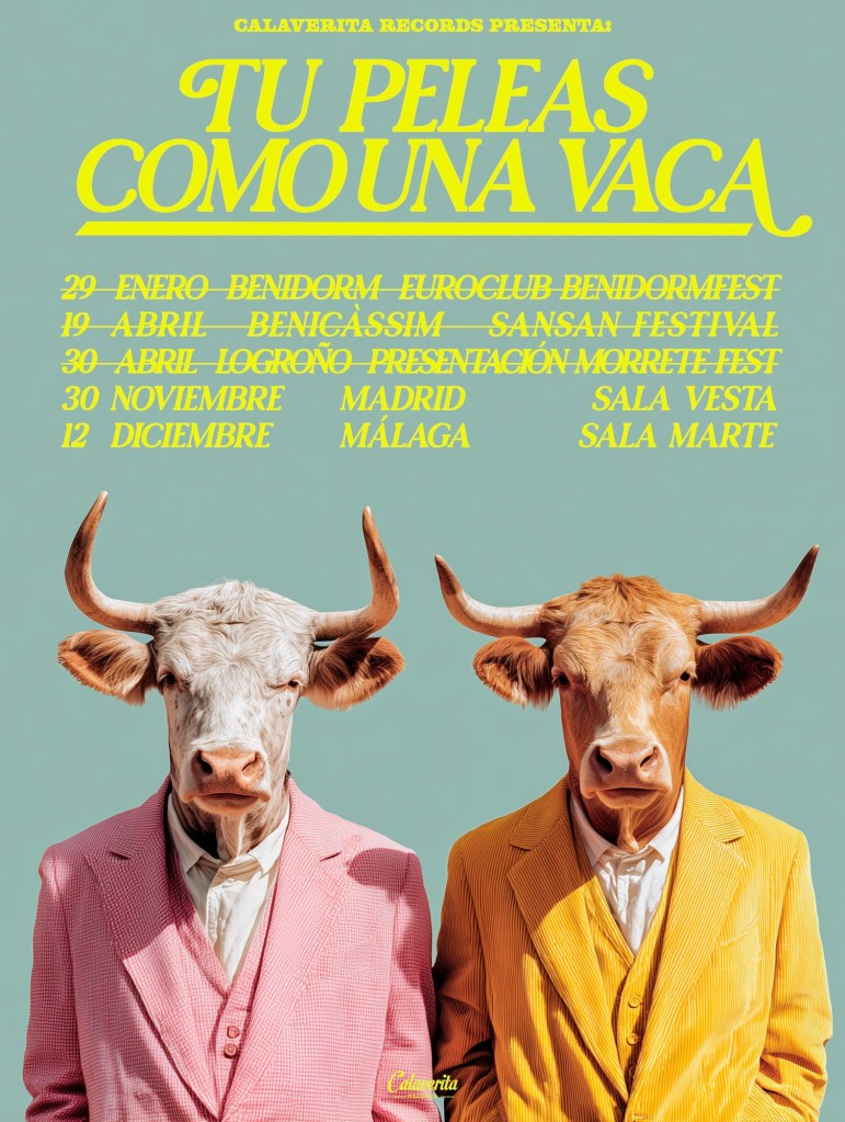 El dúo madrileño Tu Peleas Como Una Vacaestará de gira los próximos meses de 2025. Madrid y Málaga son las primeras ciudades elegidas para presentar su primer larga duración: ‘Ocho canciones para mandarte a la mierda’. Todas las entradas están disponibles en Fever. Entradas Madrid 30 de noviembre Sala VestaEntradas Málaga 12 de diciembre Sala Marte